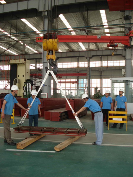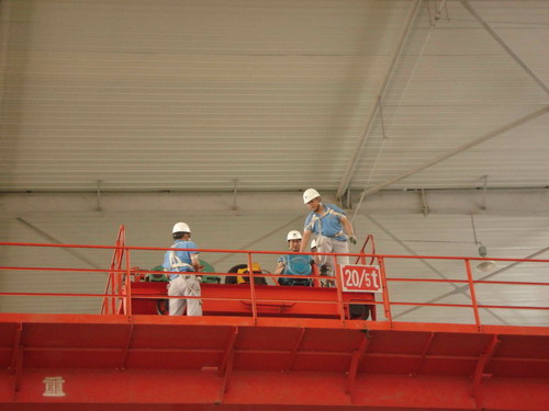 此次預(yù)演活動(dòng)的主要內(nèi)容是,吊車在運(yùn)行過程中突然停電后工作人員的應(yīng)變能力。演習(xí)開始了,首先,停電后吊車工先把開關(guān)手柄放置到“零位”并監(jiān)控總電源。同時(shí),生產(chǎn)部裝配班、物流班部分員工在各自科長的帶領(lǐng)下在吊運(yùn)物件下設(shè)護(hù)欄并監(jiān)護(hù),以防有人誤進(jìn)危險(xiǎn)區(qū)域。其次,生產(chǎn)技術(shù)部維修人員按照安全操作規(guī)程,爬上吊車走臺(tái),盤車移動(dòng)到合適位置然后慢慢拉、合抱閘把物件送回地面。最后,解除危險(xiǎn)。