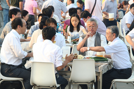 17:30,志賀進(jìn)總經(jīng)理端著酒杯,走到舞臺(tái)前,首先感謝廣大員工的辛勤努力,使公司取得很好的業(yè)績,隨著一聲“干杯”,荏原博泵第五屆納涼晚會(huì)拉開了序幕。公司380多名員工,分部門有序而坐,大家推杯換盞,興高采烈。公司領(lǐng)導(dǎo)挨桌給員工們敬酒,大家沒有了上下級(jí)的拘謹(jǐn),一派歡樂祥和的景象。