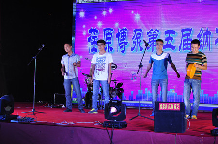 18:00,文藝演出正式開始,首先是搖滾樂隊(duì)帶來的勁爆歌曲,將晚會(huì)現(xiàn)場(chǎng)帶入了熱烈的氛圍。晚會(huì)上,有抒情懷舊的經(jīng)典老歌,有驚艷柔美的女工舞蹈,有激情四射的魅力街舞,還有新員工自編自演的三句半,更有抒發(fā)對(duì)公司深厚情感的詩朗誦《騰飛吧,荏原博泵》。有公司領(lǐng)導(dǎo)的獻(xiàn)唱,有普通員工的表演。每一個(gè)節(jié)目,都凝聚了員工的心聲,每一個(gè)節(jié)目都飽含了員工的熱情。在晚會(huì)上,公司常務(wù)副總經(jīng)理王正軍先生深情地說;今天是個(gè)歡樂的日子,荏原博泵歷經(jīng)八年的發(fā)展,從現(xiàn)在開始已經(jīng)步入了健康發(fā)展的軌道。今年公司訂單已達(dá)五個(gè)億,下一步就是生產(chǎn)、制造、交貨要交給在座各位,希望大家就像一臺(tái)機(jī)器的每個(gè)部件一樣,齊心協(xié)力配合好,公司的經(jīng)營成果會(huì)與大家共享!王總也一改往日的豪情,演繹了一首《風(fēng)往北吹》,表現(xiàn)了一個(gè)鐵血男兒柔情的一面。